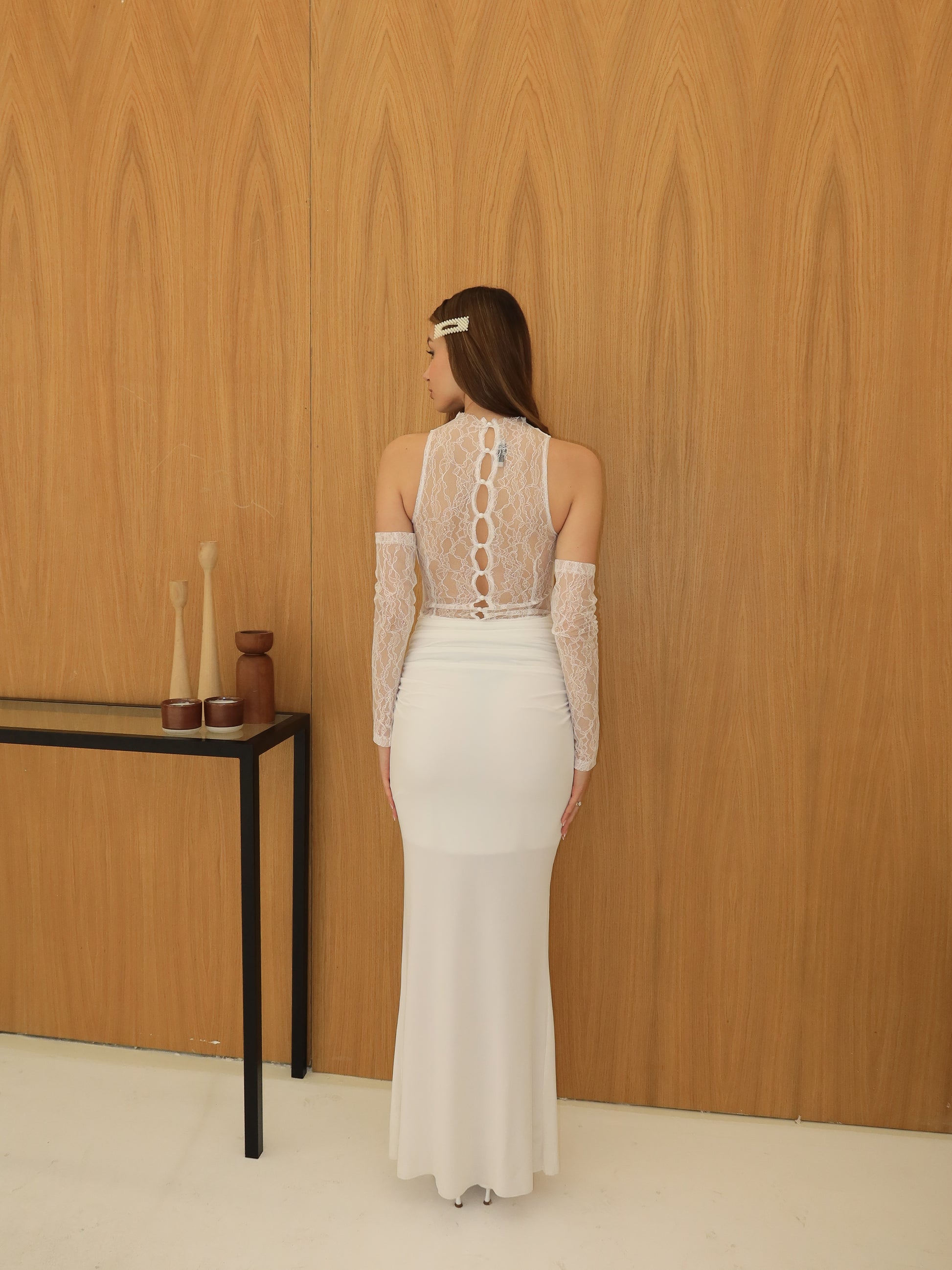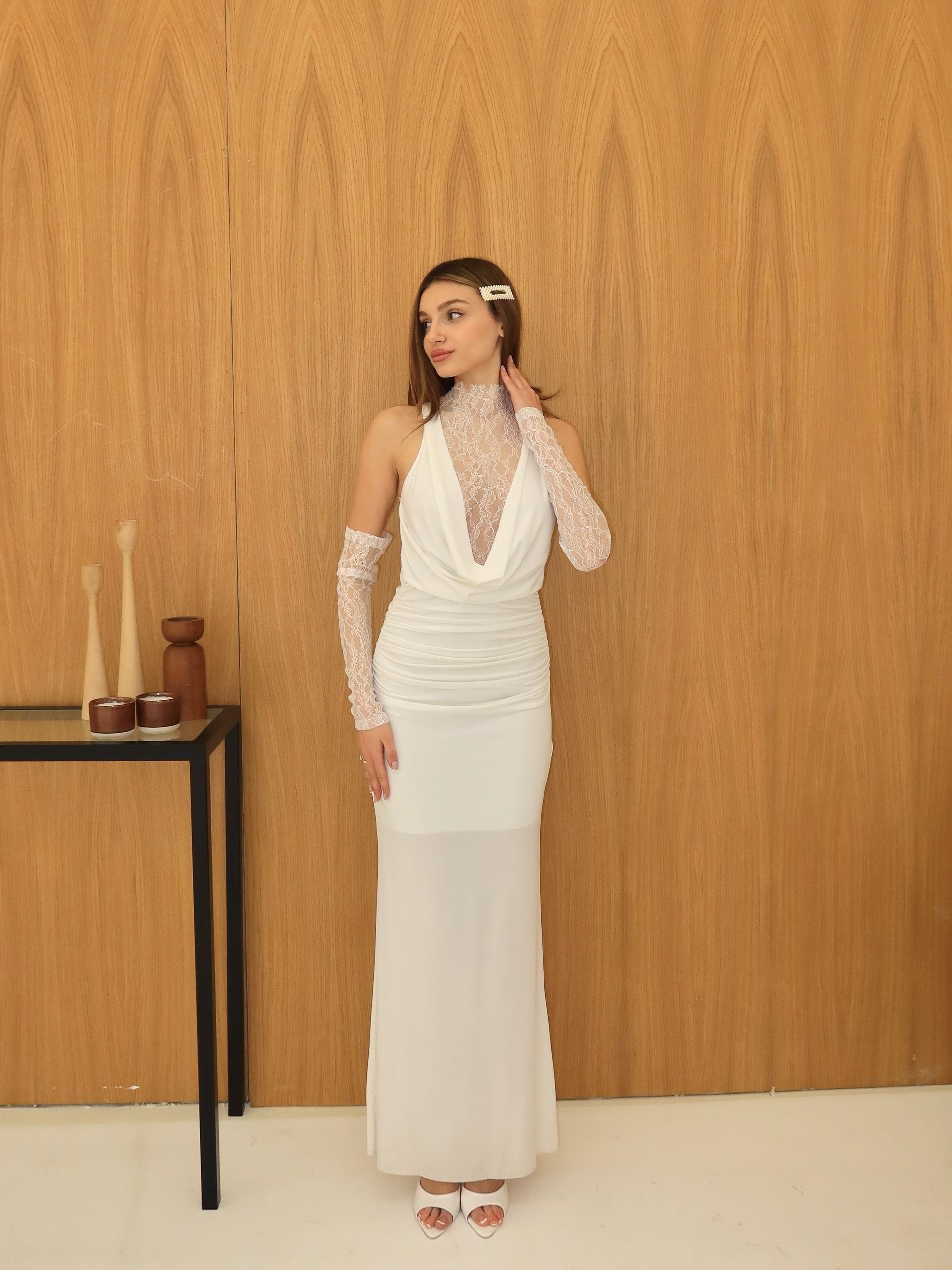 Degaje yaka beyaz elbise