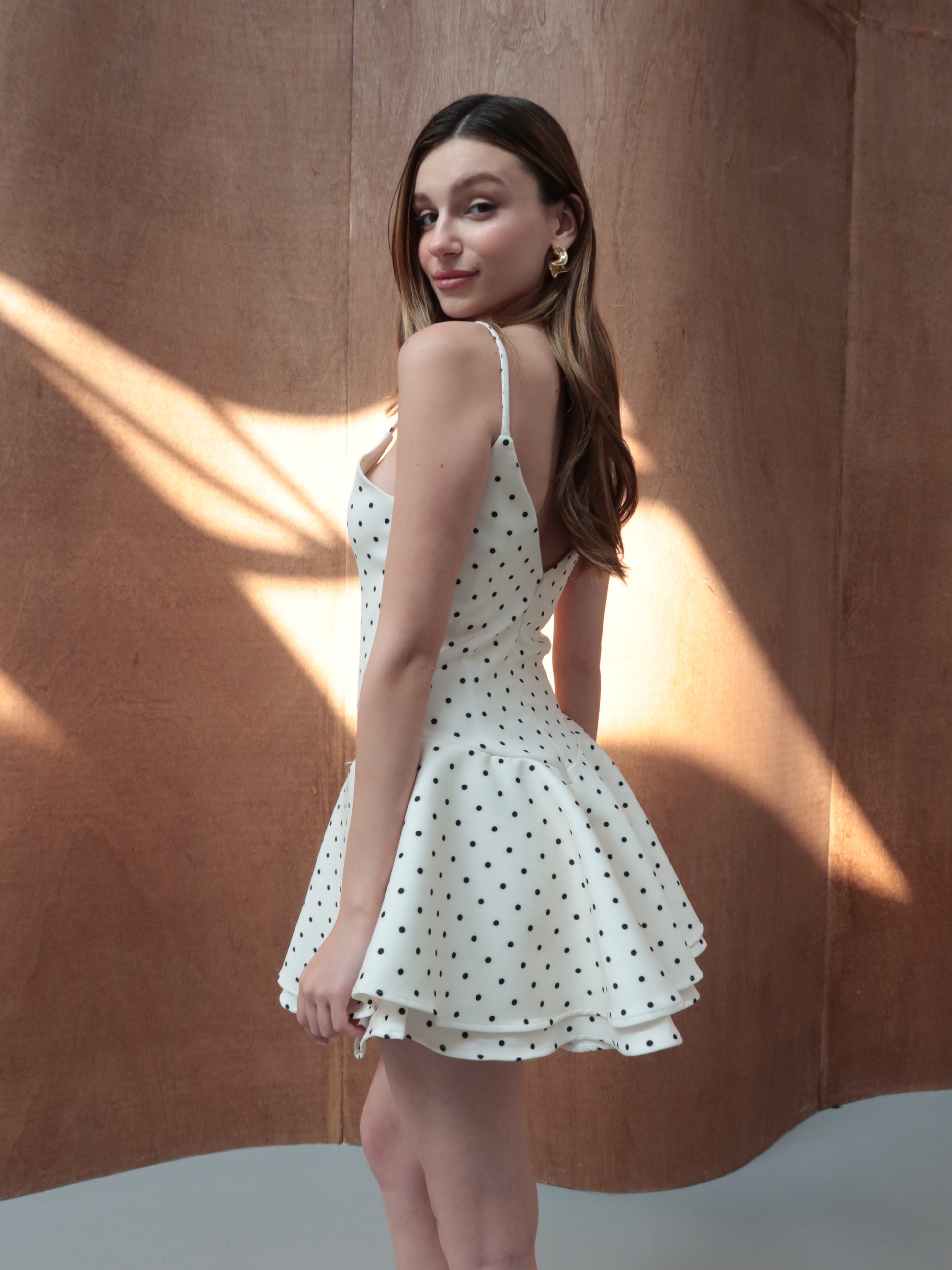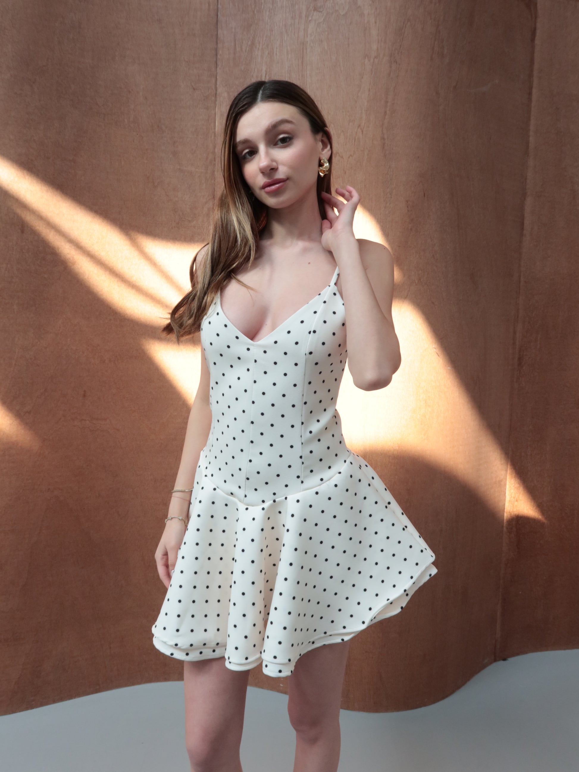 Krem puantiye desenli şortlu elbise