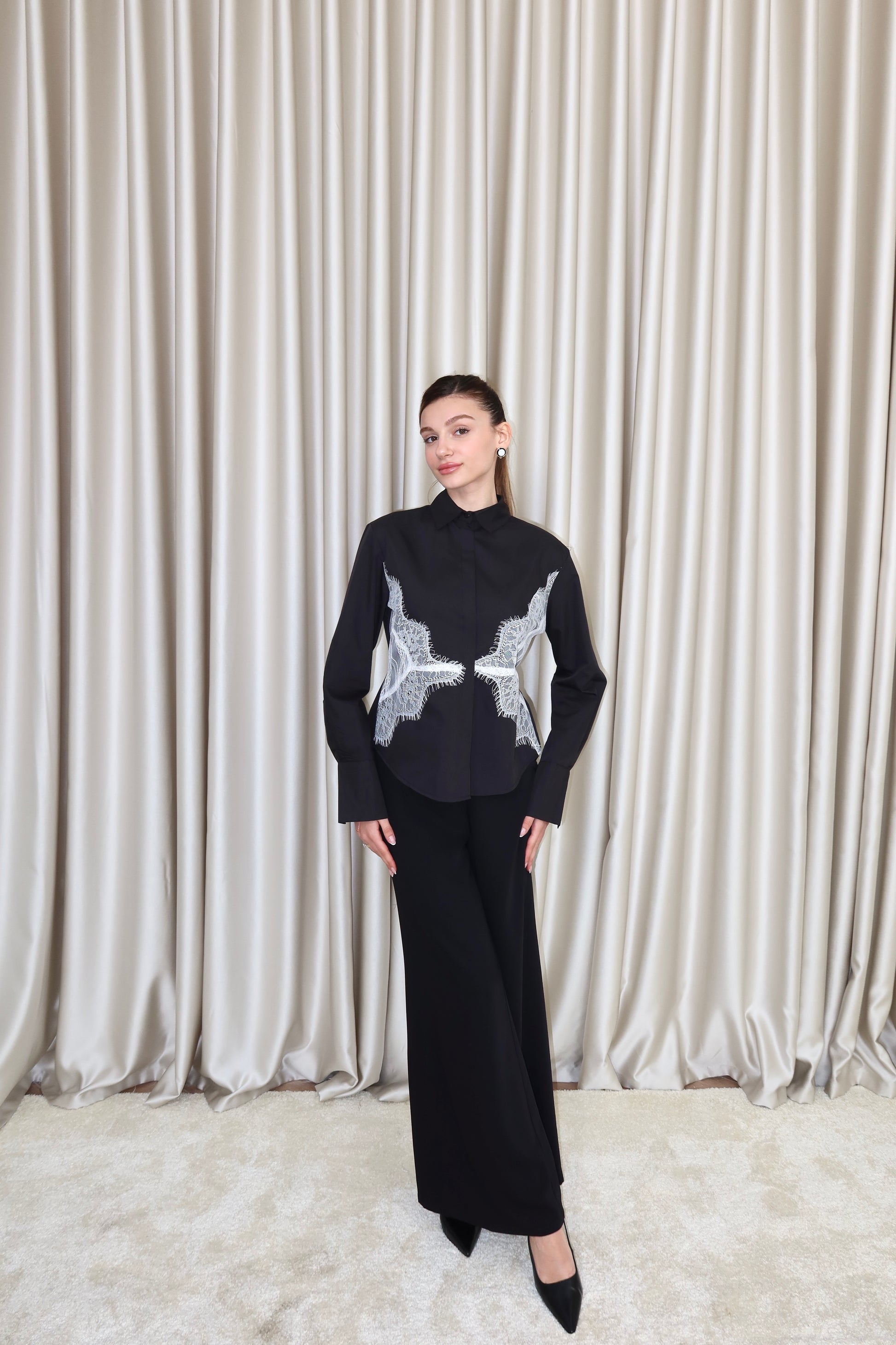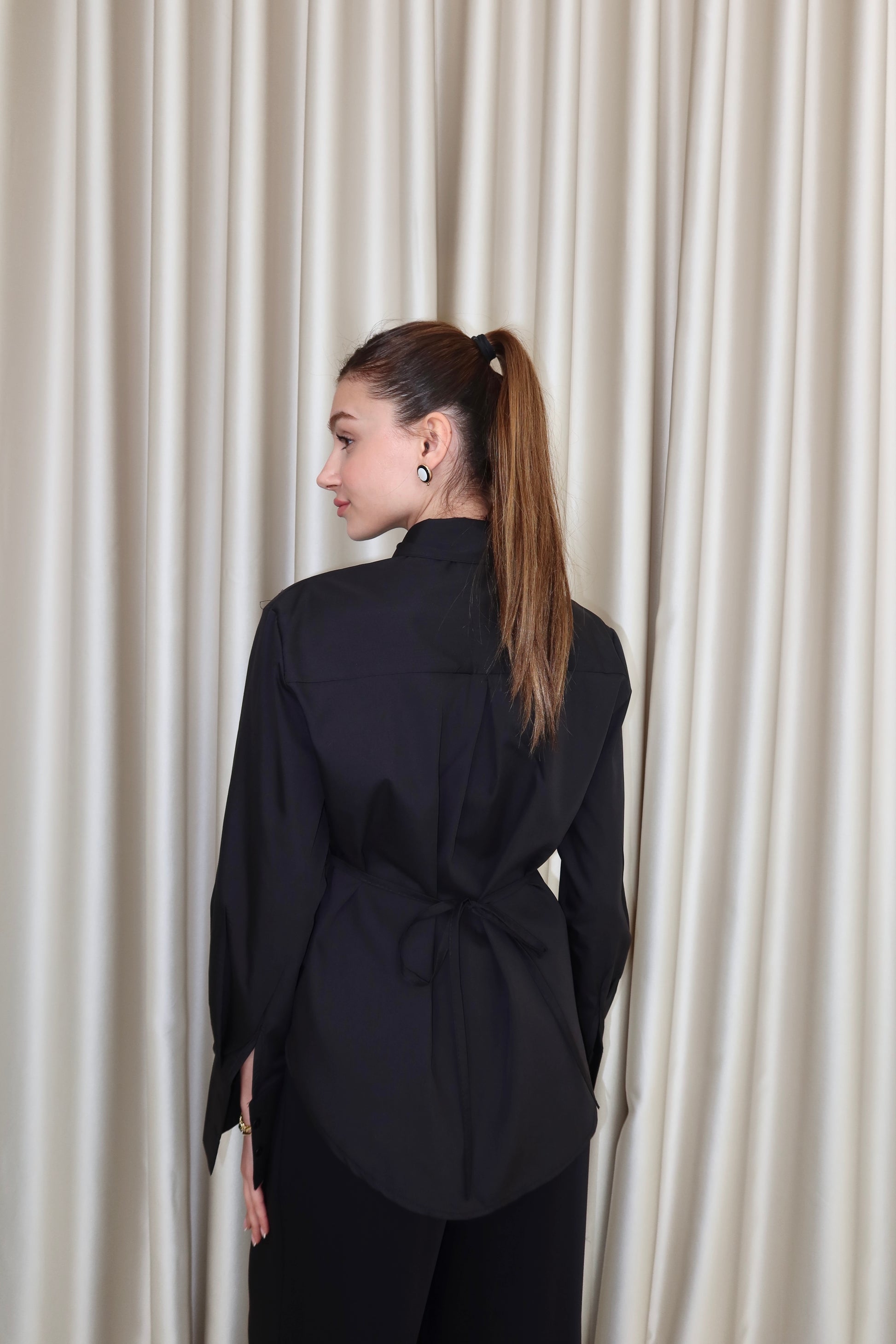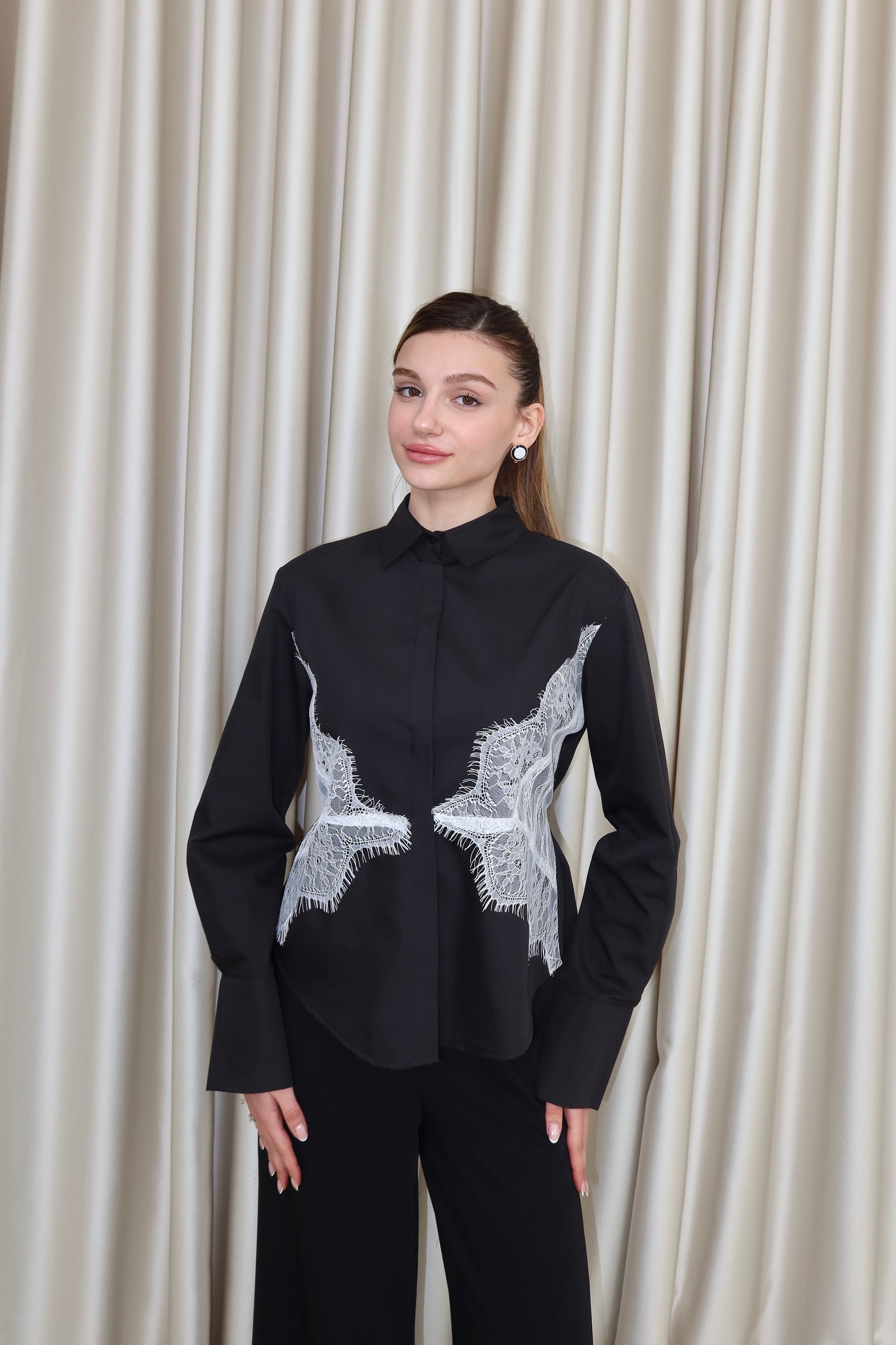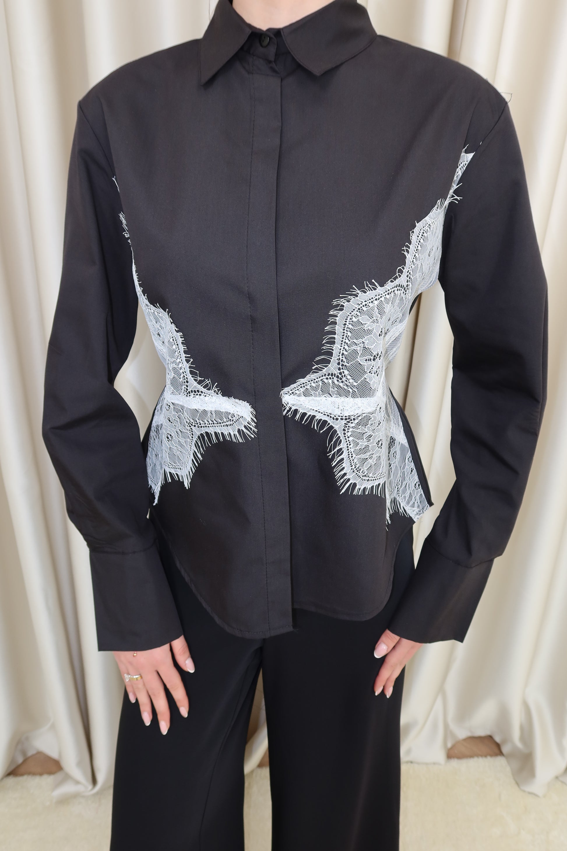 Siyah dantel detay belden bağlamalı gömlek